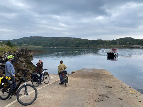 I don’t have time for dessert as I’m catching the ferry. The word ‘ferry’ is a rather grand description for the wee boat that ekes across the narrows here to the Isle of Lismore, the ‘Great Garden’. I needn’t have worried about being bang on time as it’s a relaxed affair, the boatman not even fussed about having to heft my bike aboard along with three others – there are more cyclists than locals aboard.
